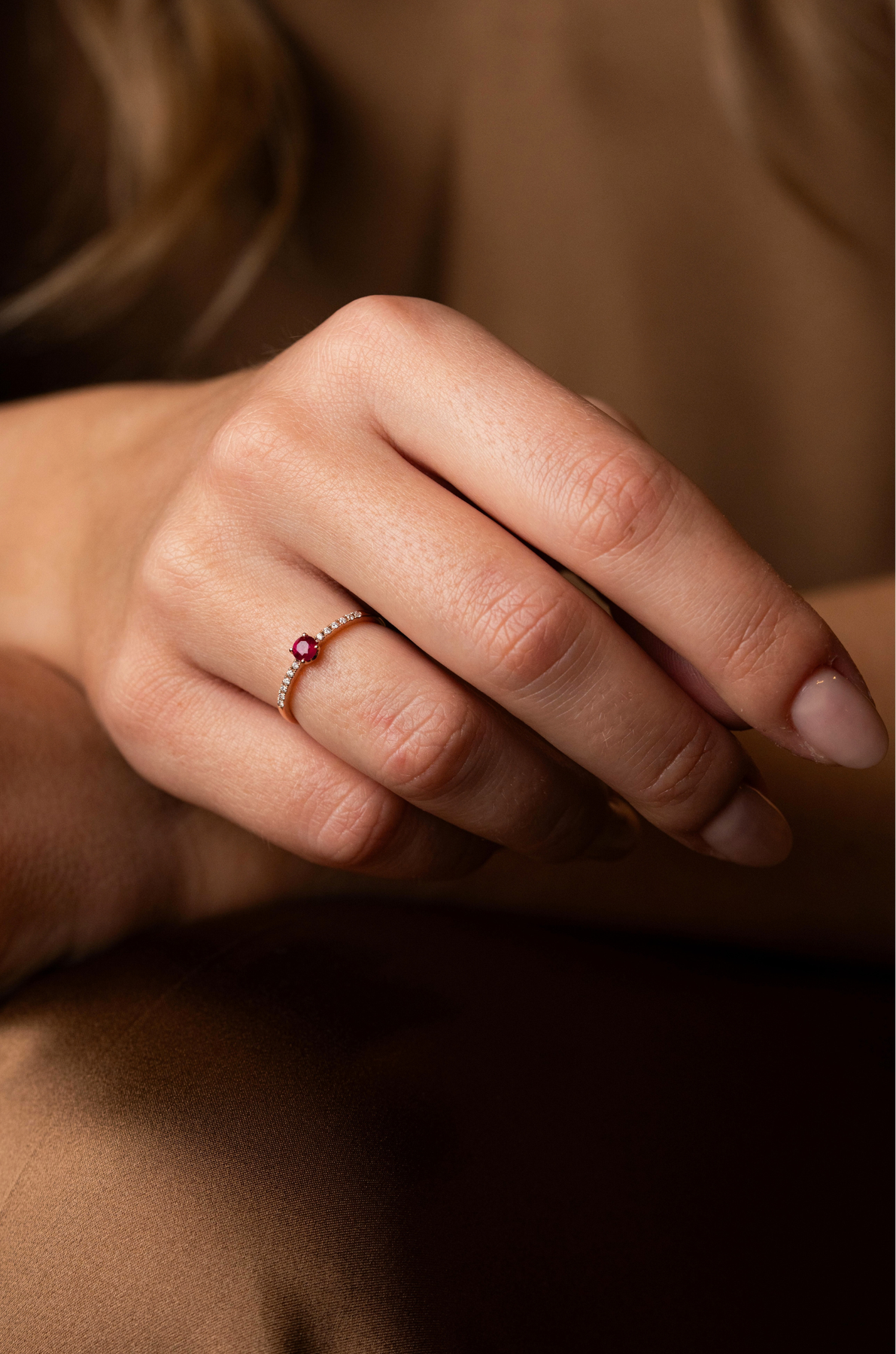 A celebration of refined beauty, this pink gold ring adorned with diamonds and a vivid ruby embodies timeless elegance with a graceful modern allure.