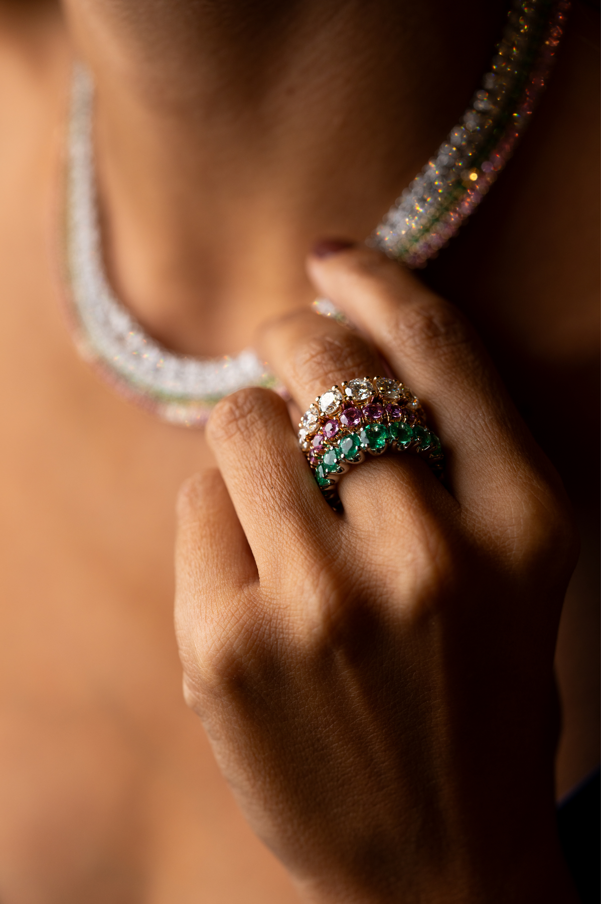 Este elegante anel de ouro branco adornado com esmeraldas é perfeito para qualquer ocasião. Perfeito para adicionar um toque de luxo e feminilidade a qualquer roupa, este anel é uma peça brilhante para ocasiões especiais.