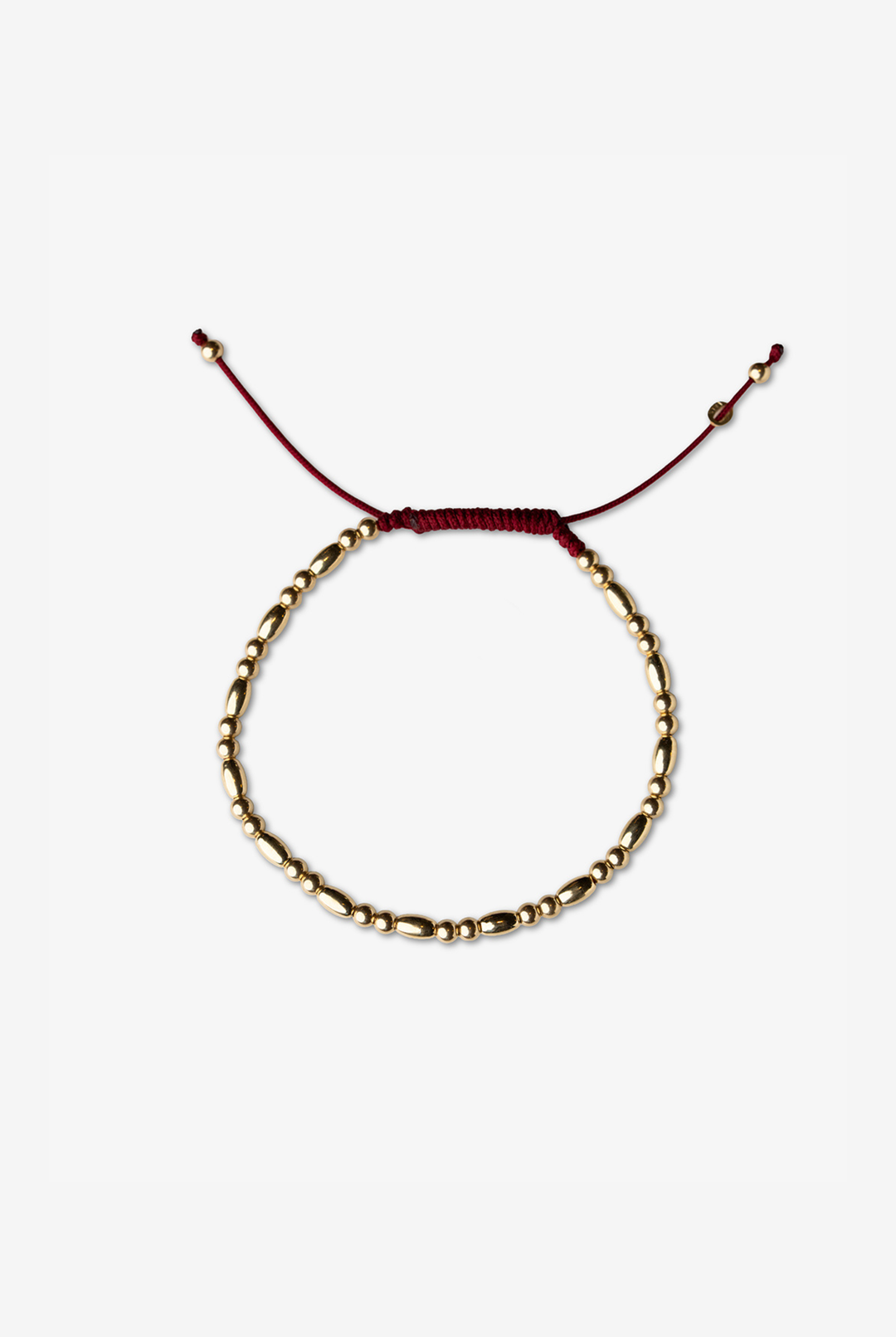 Pulseira com bolinhas em ouro amarelo e algodão bordeaux.